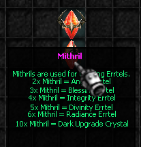 Návod pro vytvoření Mithrils, Errtels and Dark Upgrade Crystals 1x Mithril = 255x Mithril Fragments (Automaticky vytvořeno v inventáři) 2x Mithril = Anger Errtel (Chaos Mix) 3x Mithril = Blessing Errtel (Chaos Mix) 4x Mithril = Integrity Errtel (Chaos Mix) 5x Mithril = Divinity Errtel (Chaos Mix) 6x Mithril = Radiance Errtel (Chaos Mix) 10x Mithril = Dark Upgrade Crystal (Chaos Mix)