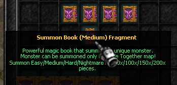 hráč sbírá Fragmenty těchto knih, které po nasbírání určitého počtu vytvoří automaticky velkou knihu, ze kterého se nám monstrum zrodí (vyhodit lze jen v mapě Boss Battle Together, vstup Lorencia 131 126)