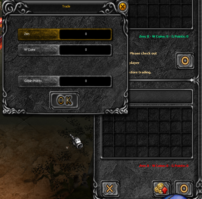 při obchodování mezi hráčem a hráčem (trade) lze zadat i sumu ostatních platidel (po stlačení tlačítka "ZEN"), které chceme danému hráčovi dát